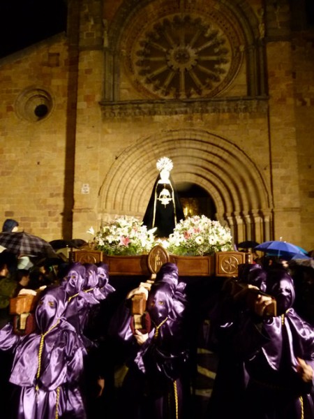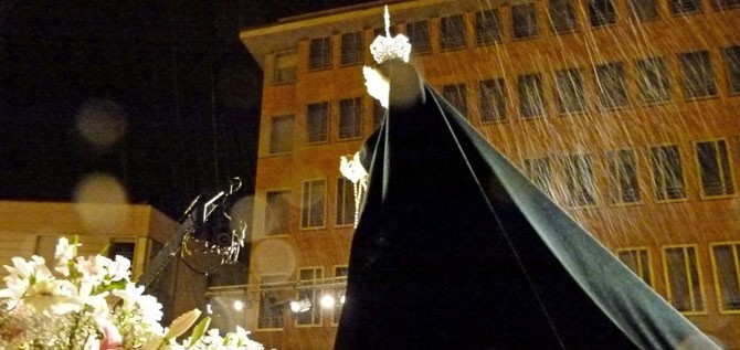 Con ganas empezó a llover sobre las 21 horas, cuando la hora anunciada para salir eran las 21,15, con un público expectante en torno a la Parroquia de San Pedro, que aguantó con paraguas la persistente lluvia, Poco antes de las 21,45 se abrió la puerta para dar paso a la oración prevista junto a la imagen de la Palomilla.