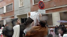 Casi a la carrera, aunque a los pocos minutos la lluvia cesaba, la comitiva hizo lo posible por llegar cuanto antes a la Parroquia de San Antonio, donde arribó a las 13,30 horas.