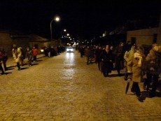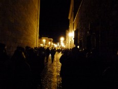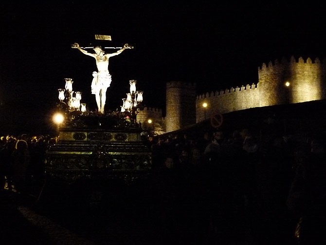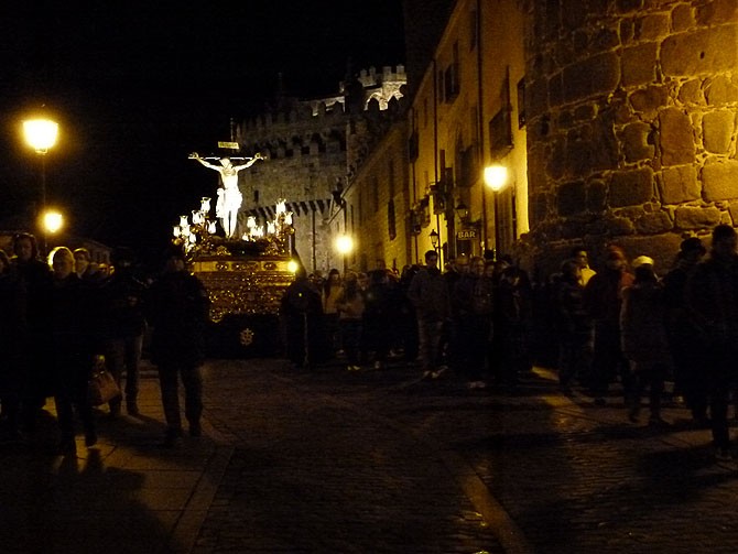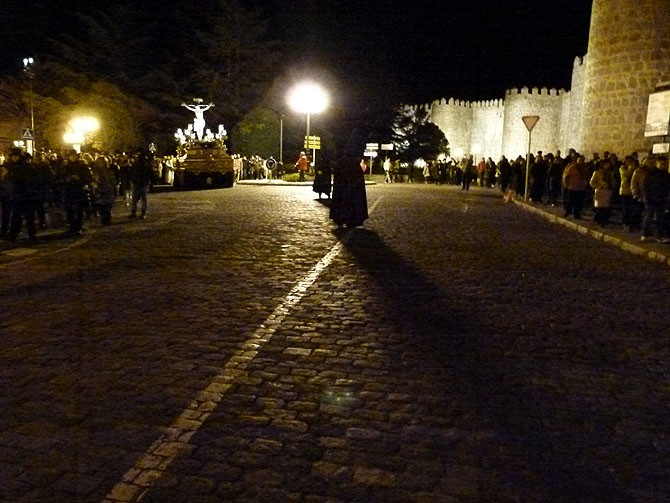 El paso penitencial va dejando imágenes llamativas con la muralla de fondo, al pasar por el arco del Paso de la Harina, con el arco de San Vicente, el lienzo norte o la subida hacia el Rastro, que cualquier abulense recoge, pero también algunos turistas e incluso una pareja de japoneses.