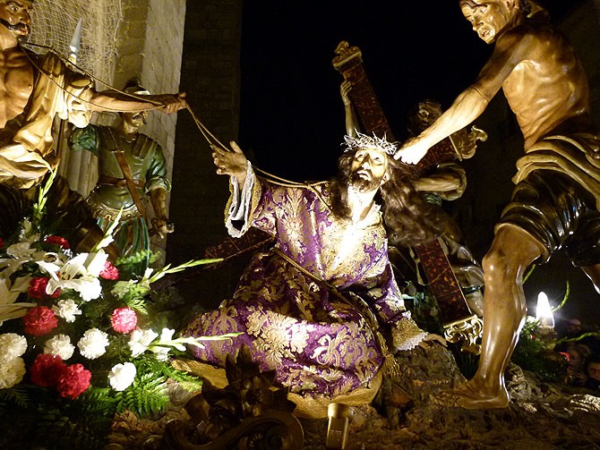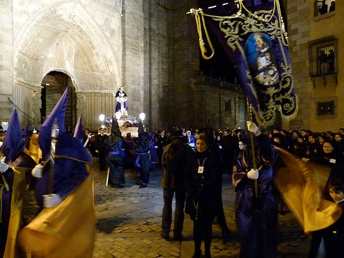 Junto a sus capuchones de luto con un fajín morado, numerosos penitentes de todas las entidades penitenciales de la Semana Santa abulense, para acompañar a siete pasos -entre ellos el de Jesús de Medinaceli, que ya salió el Martes Santo y la Virgen de las Angustias, el Miércoles Santo- como el Prendimiento y La Caída.