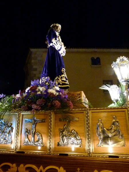 Fue a las 20,30 horas, cuando se inició la salida del desfile procesional del Viernes Santo, el que marca el punto más alto de la Pasión de Jesucristo, y que contó con cientos de personas en las aceras para presenciar la procesión del Real e Ilustre Patronato de Nuestra Señora de las Angustias y Santo Sepulcro.