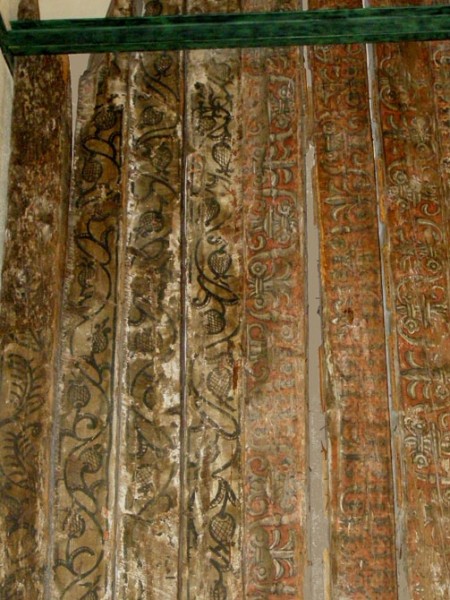 Los elementos del alfarje, techo de madera horizontal y entrelazado compuesto por vigas maestras denominadas jácenas, fueron recogidos por Luis Monteagudo en los años 1968 y 1969, en una campaña de recuperación que se llevó a cabo cuando se rehabilitó el edificio en establecimiento hotelero.