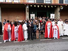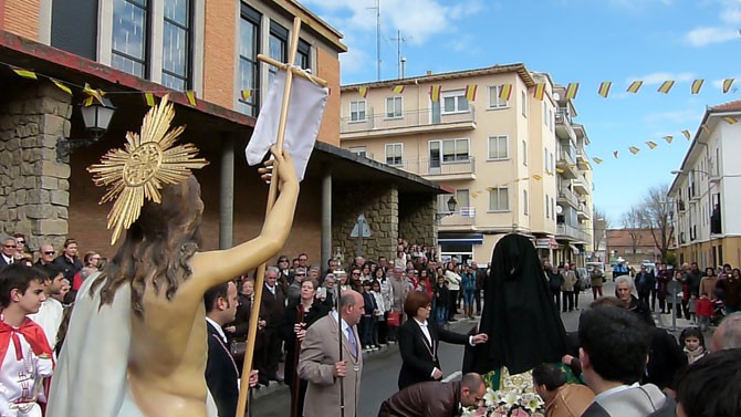 Ante la Parroquia de la Sagrada Familia, el encuentro entre el Santísimo Cristo del Resucitado y Nuestra Señora del Buen Suceso, a la que se retira el pañuelo negro, sirve para una fiesta que desde primera hora de la mañana ya habían pregonado los miembros de la cofradía por las calles del barrio de la Cacharra.