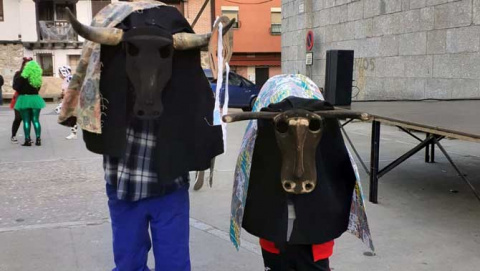 Tras vestirse en los garajes y casas de la localidad, los cucurrumachos han hecho sonar los cencerros que portan en sus espaldas, mientras se dirigían en procesión junto a los siete ‘quintos nuevos’ (cuatro mujeres y tres hombres) hasta la plaza donde en la noche del sábado fue plantado el mayo en torno al cual ha girado este domingo la ceremonia nuevamente.