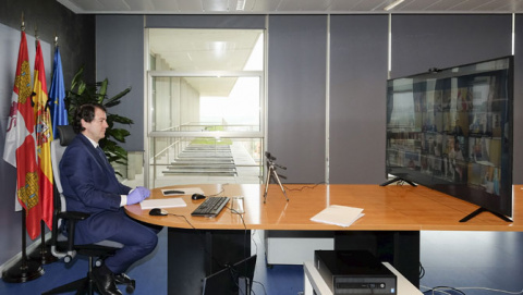 El presidente de la Junta durante la vídeoconferencia con el resto de presidentes.En la quinta videoconferencia con los presidentes autonómicos tras la declaración del estado de alarma, Fernández Mañueco ha demandado que los trabajadores que se incorporen cuenten con la adecuada protección personal para desempeñar su labor sin riesgos, así como el establecimiento de protocolos claros de prevención y de control, medidas todas ellas que no se dan en este momento.