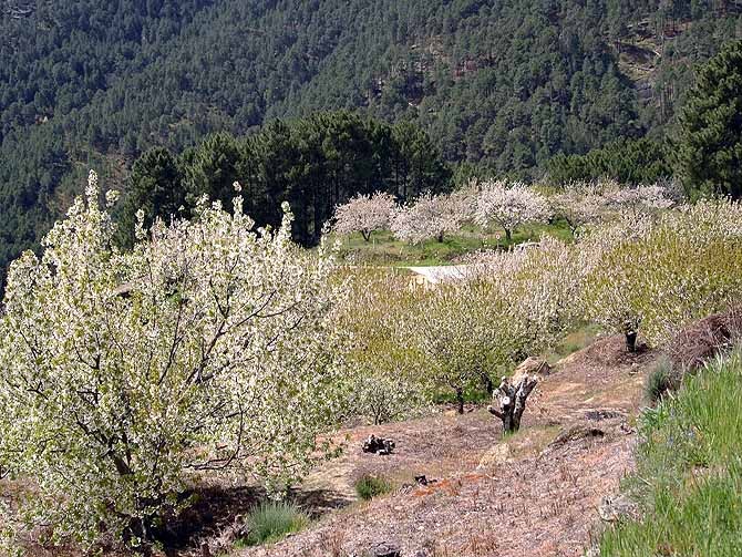 La imagen “nada tiene que envidiar al Valle del Jerte, porque la gran diferencia es que allí sólo puede verse la floración de los cerezos, mientras que en El Hornillo se contemplan pinares y castaños, además de la nieve en las cumbres”, presume el hornillento.