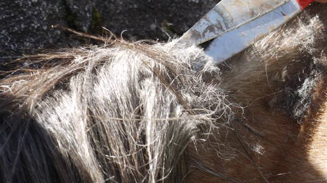 Enjauladas las reses, el corte de las crines y de las colas de yeguas y caballos a tijera manual es el momento que más llamó la atención de los llegados desde pueblos cercanos, la capital abulense, Madrid y Cáceres.