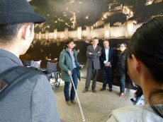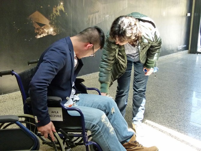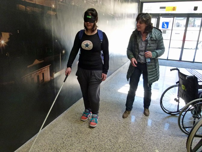 De la mano de los técnicos municipales y concejala de Accesibilidad, Noelia Cuenca, han probado a andar con un bastón de invidente y un antifaz, y a circular con silla de ruedas en el Centro de Recepción de Visitantes.