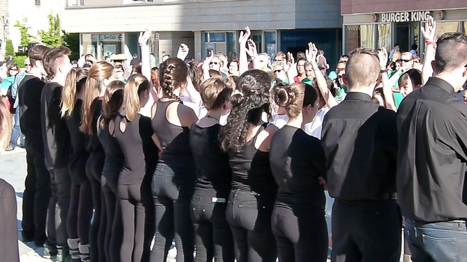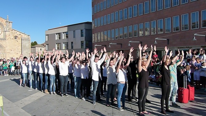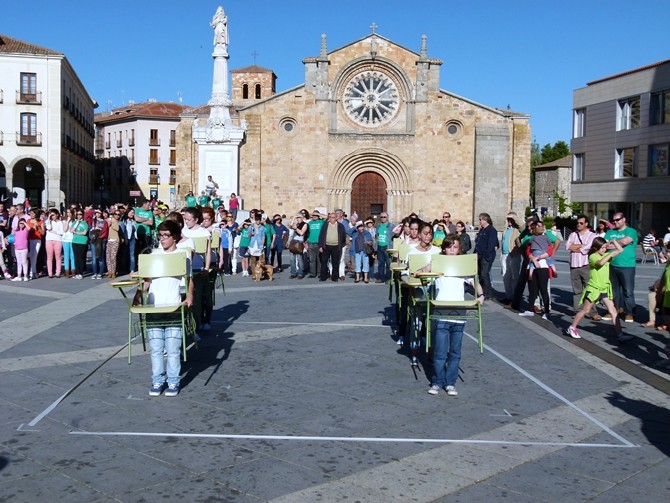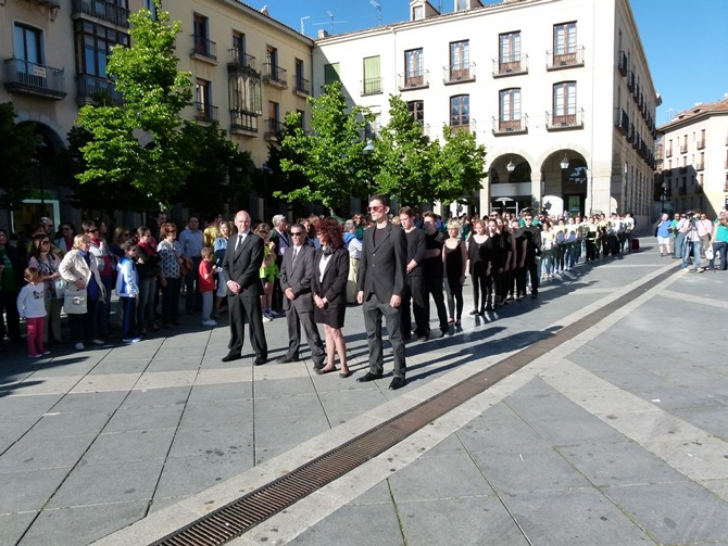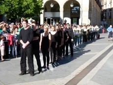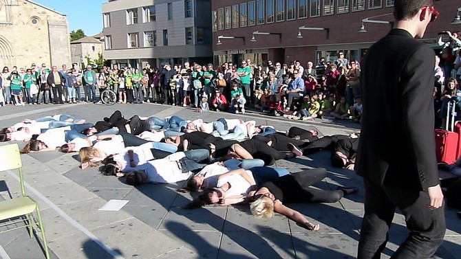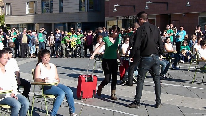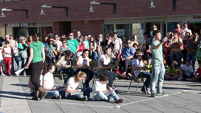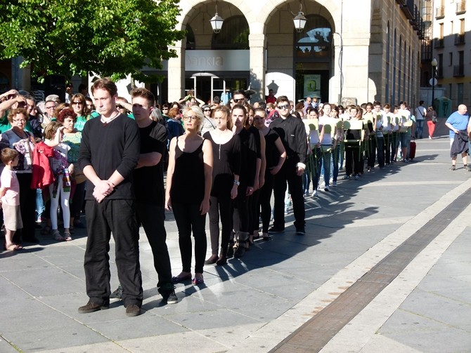 Alumnos de teatro de los institutos Isabel de Castilla y Alonso de Madrigal, padres y profesores, bajo la dirección de Pilar Rodríguez, escenificaron la versión de la reforma educativa en el Mercado Grande, sin palabras y con música clásica, recortando a la educación pública en beneficio de la concertada.