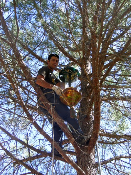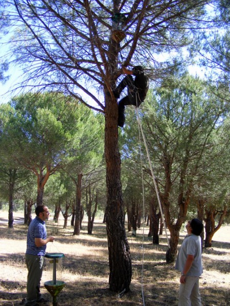 Tras la fase de recopilación y estudio bibliográfico, ha comenzado el trabajo de campo en los montes de utilidad pública del municipio, en colaboración los investigadores con el piñonero local Juan José Melero, que ayuda con la técnica tradicional de recolección de piñas en la colocación de las primeras trampas.