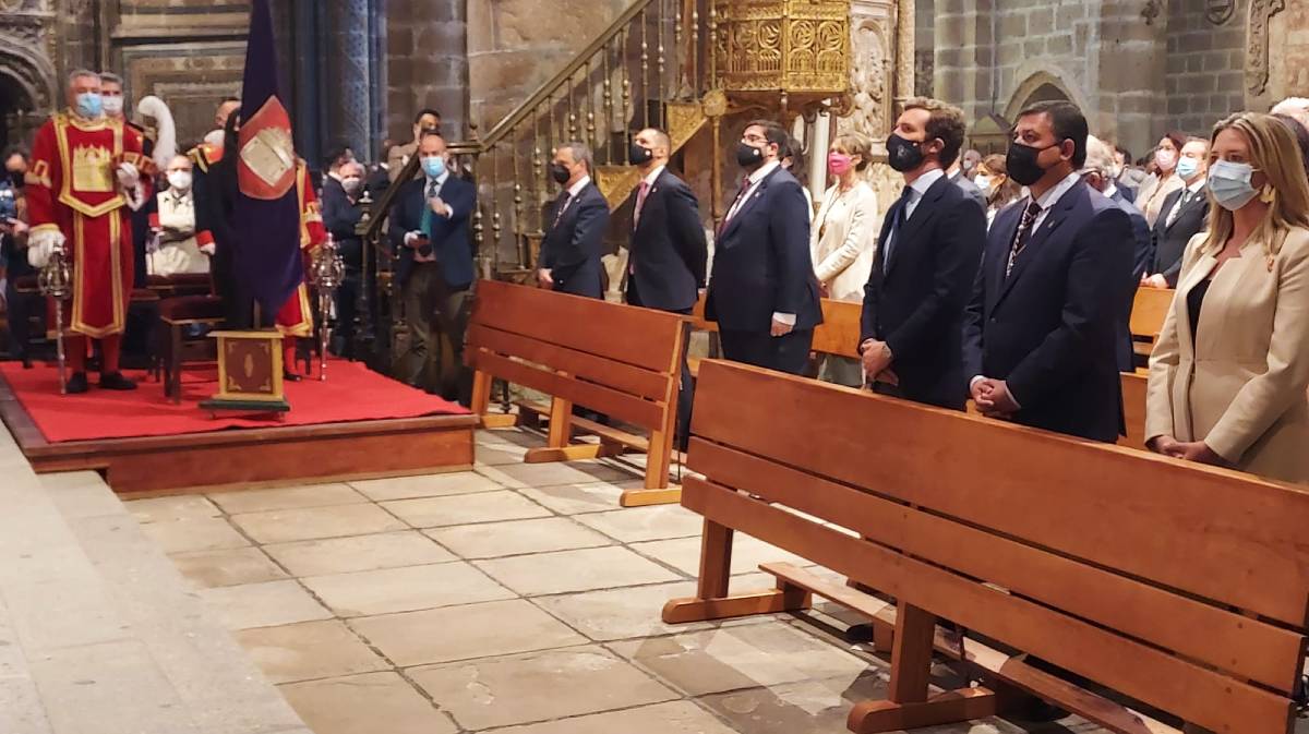 Casado se ha sentado en uno de los dos primeros bancos, junto al presidente de la Diputación de Ávila, Carlos García, y la diputada Alicia García.