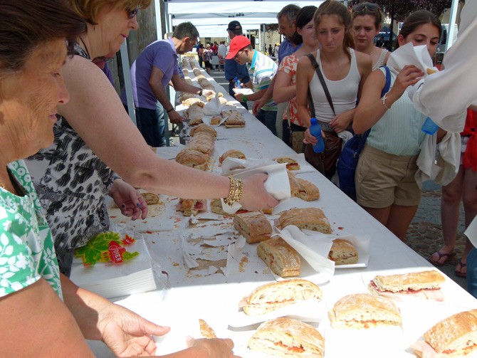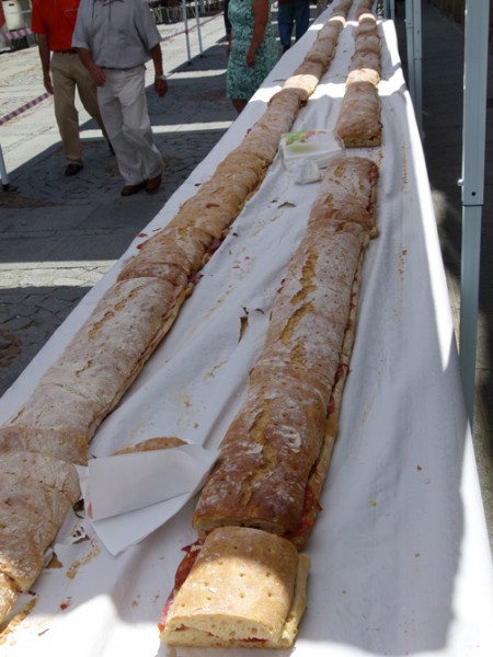 Con barras de pan de 1,2 metros de longitud unidas entre sí, con chorizo, queso y salchichón, los miembros del Rotary Club prepararon el bocadillo, que jóvenes de la asociación expendieron a dos euros con una botella de agua en la plaza de Pedro Dávila el domingo al mediodía.