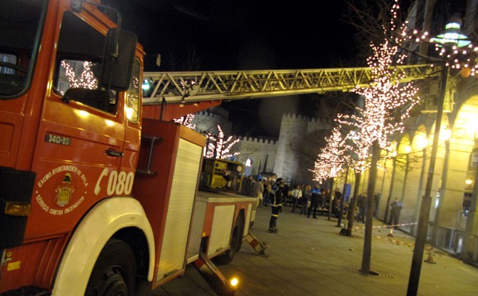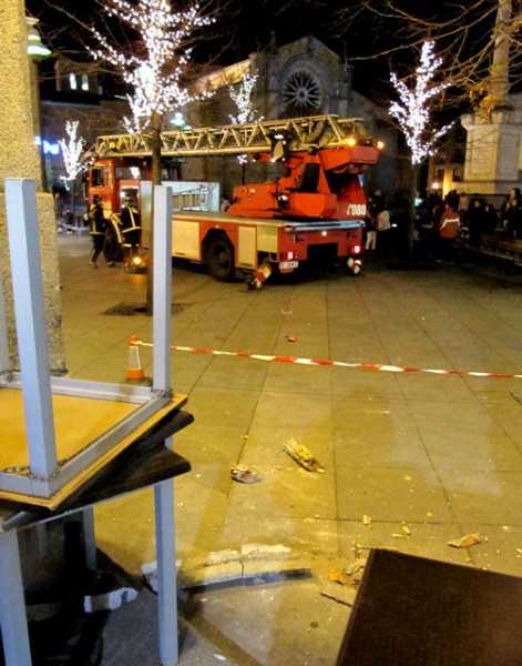 Después, y sin que hubiera que lamentar desgracia personal alguna, las miradas centradas en la pista de hielo se volvieron hacia la intervención de los bomberos, que desplegaron la escala para asegurar que no hubiera más desprendimientos en el número 6 de la plaza de Santa Teresa.