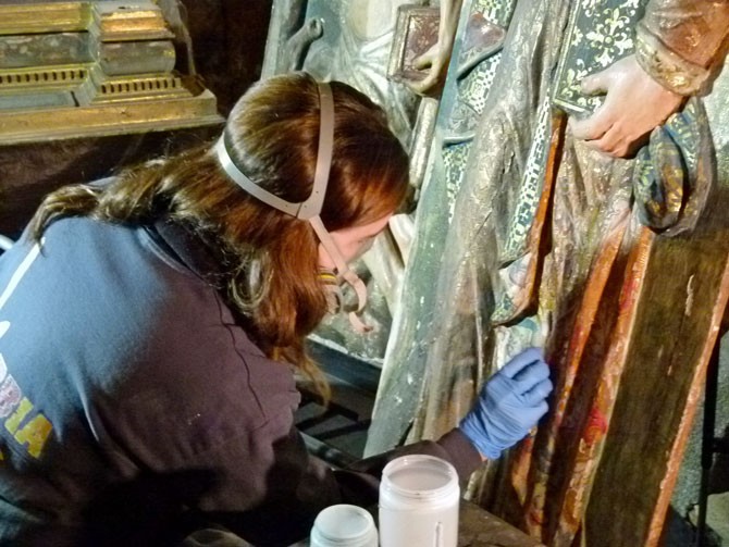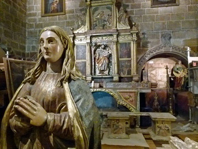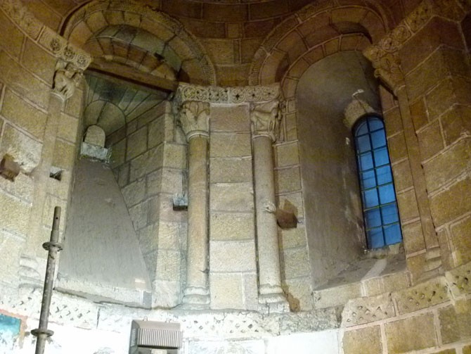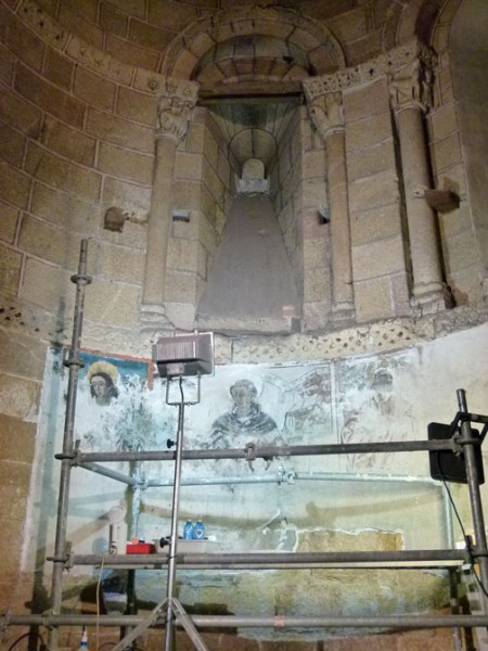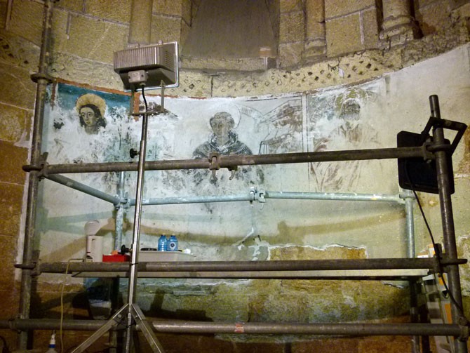 Lo habitual es observar una obra de arte restaurada. En el caso de los ábsides de la iglesia de San Pedro podrá observarse cómo trabajan en recuperarlos.