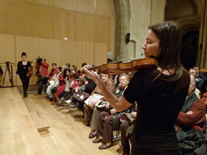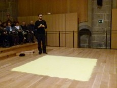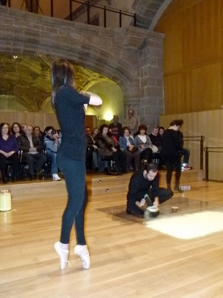 Bajo el nombre ‘Sonimaginariosgestuales’, entre asientos y butacas del Auditorio de San Francisco, ha configurado en el suelo un cuadrado elaborado a base de polvo de color amarillo. En torno a él las integrantes de The Funamviolistas Ana Hernández, al violín, y Maite Olmedilla, a la viola, pusieron banda sonora al proceso del autor.
