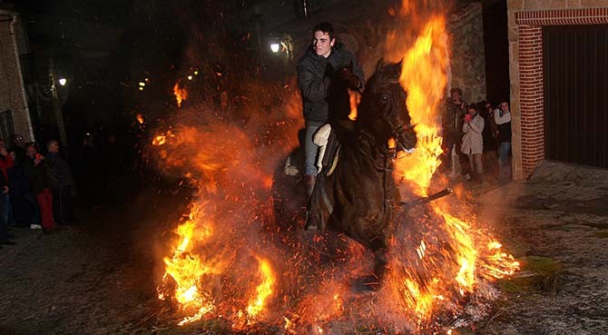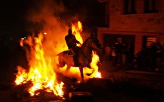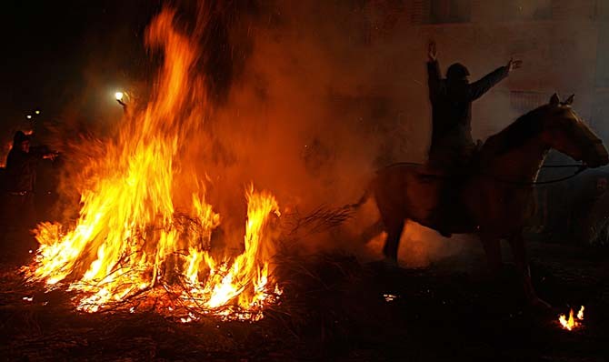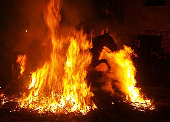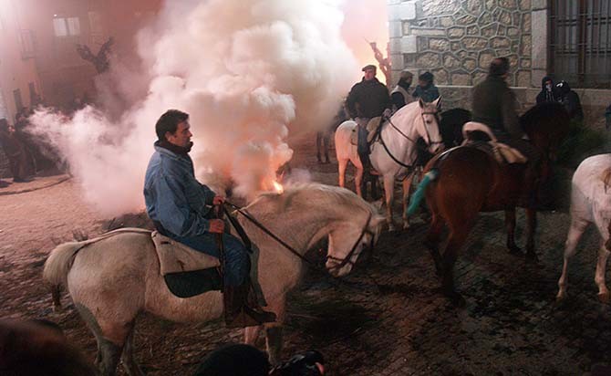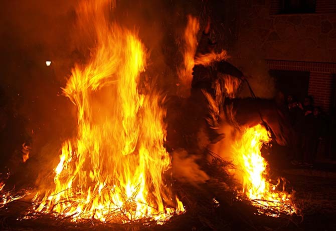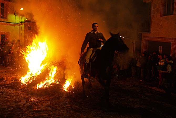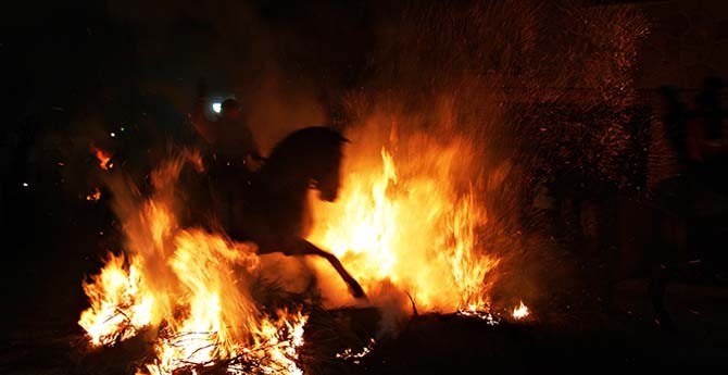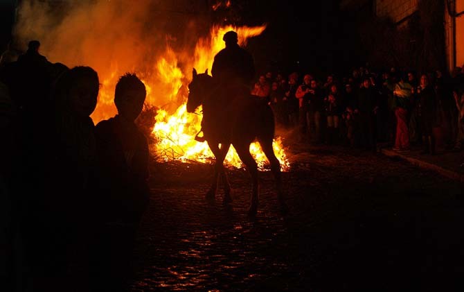 En una noche cuya frescura contrastó con el tremendo calor de las altas hogueras, más de un centenar de caballos, yeguas y algún burro desfilaron por la empinada cuesta de una localidad que se avista en la lejanía por el humo de más de una veintena de hogueras que, un año más, purificaron a los animales en la festividad de su patrón, San Antón.