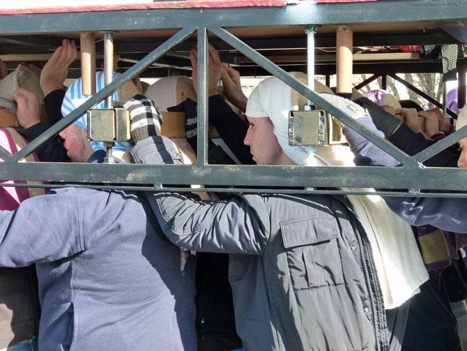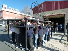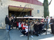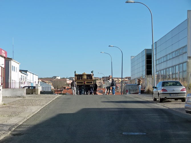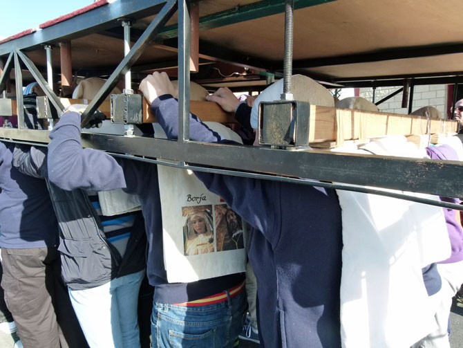 Es un ejemplo de los preparativos de la Semana Santa. Desde la nave donde se guardan los pasos, procesionan por las vacías calles del Polígono Industrial Las Hervencias con vigas en vez de imágenes para intentar alcanzar los 1.200 kilos que pesará el Martes Santo el trono de Jesús Redentor ante Caifás, con 40 costaleros, y 800 kilos el de la Virgen de la Estrella, con 30 costales.
