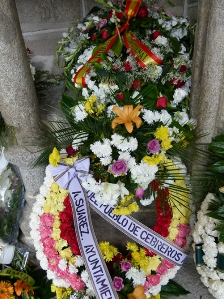 Antes de llegar a la lápida del expresidente del Gobierno y su esposa -y a la de Claudio Sánchez-Albornoz-, se recorre un primer tramo con coronas de flores a ambos lados, lo que también llama la atención a la curiosidad de los visitantes.