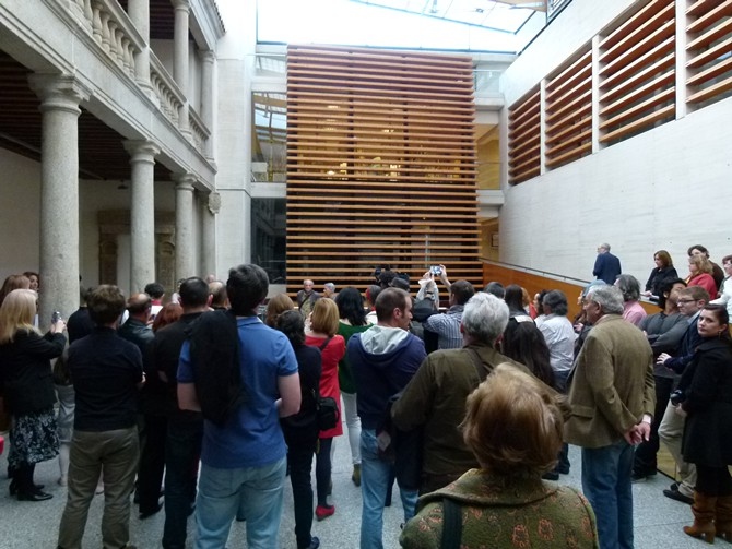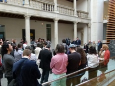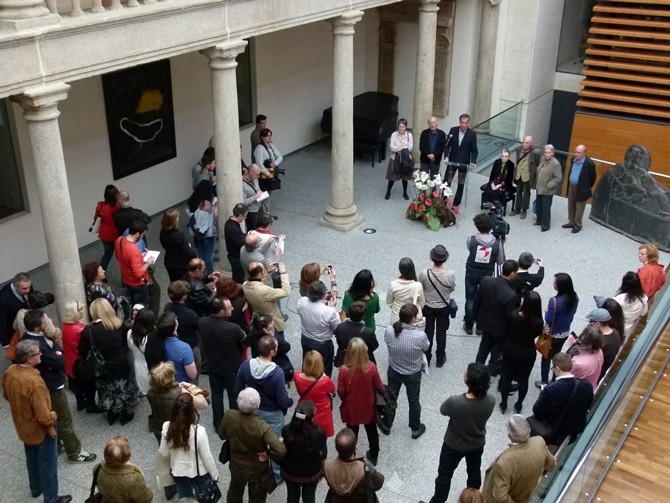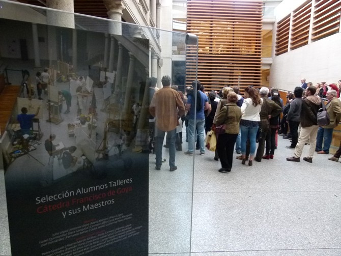 Junto a su esposa, María Moreno, ha inaugurado la exposición, compuesta por 60 obras, cuyos autores con 12 maestros y 21 alumnos que participaron en el curso de 2013 de la Cátedra Francisco de Goya, en su octava edición y organizada por la Facultad de Bellas Artes de la Universidad Complutense de Madrid.