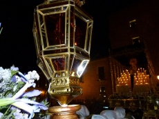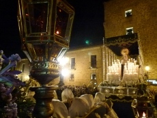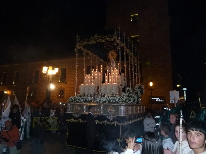 Cientos de personas acudieron a la salida de la procesión de Nuestra Señora de la Esperanza, donde la fuerza y la pericia son imprescindibles para la compleja tarea de sacar los pasos. A las 19,30 horas comenzó el rito que culminó una hora después, cuando la Esperanza era regada de pétalos desde los balcones de la calle Blasco Jimeno.