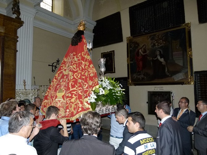 Tras dejar a la virgen en el convento de la Encarnación, los miembros del Patronato de Las Vacas han repuesto fuerzas en el entorno, para luego visitar las iglesias de San Martín y Santa María de la Cabeza y alcanzar la avenida de Madrid.