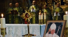 La escultura policromada que reproduce la imagen del papa ha sido bendecida en una misa de acción de gracias por su reciente canonización y la del pontífice Juan XXIII.