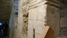 El hallazgo se ha logrado al examinar el hueco de acceso a la terraza de la fachada. El aspecto defensivo de la primera portada es evidente, como el de otras muchas parte de la catedral, como el de la girola inserta en la muralla.