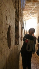 Debajo del hueco de acceso y entrando desde la terraza que da al interior del templo se encuentra un habitáculo, a modo de una estrecha habitación alargada de 7,5 metros de largo por metro y medio de ancho, a unos tres metros de profundidad de la bóveda y a 12 metros de altura. A un lado se encuentra un muro, sobre el que se encuentra la fachada actual, del siglo XVIII, y al otro, el lienzo hallado ahora, lo que en su día fue la fachada original: siete merlones y seis almenas.