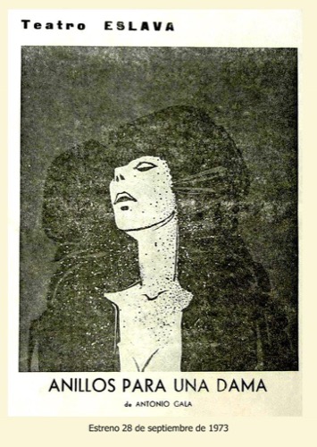 De la amplia producción teatral de Antonio Gala, la obra ‘Anillos para una dama’ (1973), Premio Nacional de Literatura, es la que, quizás, haya tenido más arraigo entre el público de Ávila. La obra se ambienta en los años posteriores a la muerte de El Cid, Rodrigo Díaz de Vivar, en los que Doña Jimena, su viuda, quiere, alegóricamente, proclamarse libre en la España de Franco. Es una metáfora sobre la situación social de la época. Y hablando del Campeador, recordamos que hacía más de una década desde que El Cid y Jimena, interpretados por Charlton Heston y Sofía Loren habían estado en Ávila rodando algunos planos de la película que dirigía Anthony Mann en 1961.