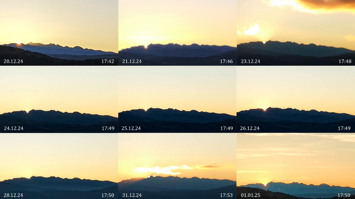 En este último gráfico sucede la segunda anomalía, una reversión o retroceso del tiempo en la línea del horizonte. En días precedentes el ocaso se situaba en la portilla Bermeja, el 27 presuntamente y el 26 certificado y cual escalador hacia la cima del Almanzor, Al-Mansur en árabe que significa el “El victorioso”, el día 28 ya está en la ladera del pico y sigue ascendiendo hasta el último día del año, el 31 de diciembre, pero al día siguiente y ya 1 de enero de 2025, retrocede hasta la portilla Bermeja. Esta última fotografía fue tomada desde la casa familiar de Hoyocasero por Emiliano Martín, artista y hermano del autor de esta investigación.