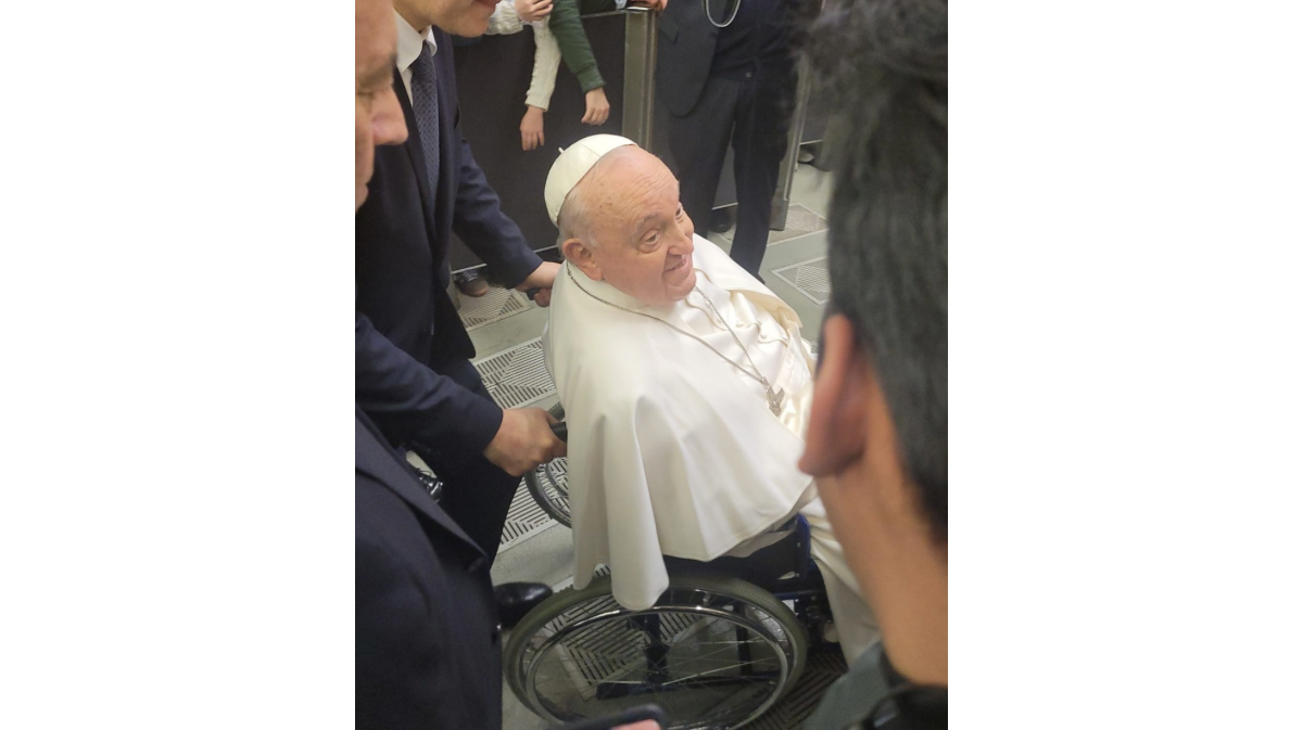 El primer encuentro ocurrió el 25 de enero en el Aula Pablo VI, durante la audiencia general. En un principio, Francisco iba a leer un mensaje especial para los comunicadores, pero finalmente pasó la palabra al prefecto del Dicasterio para las Comunicaciones. "Ahí ya nos dimos cuenta de que estaba muy cansado", recuerda Rueda. "Nos dijeron que venía de cuatro o cinco audiencias previas y se le notaba. Estaba en silla de ruedas, pero, a pesar de todo, hizo el esfuerzo de recorrer los pasillos saludando a la gente. Incluso bendijo a los bebés que llevaban algunos compañeros", cuenta con emoción.