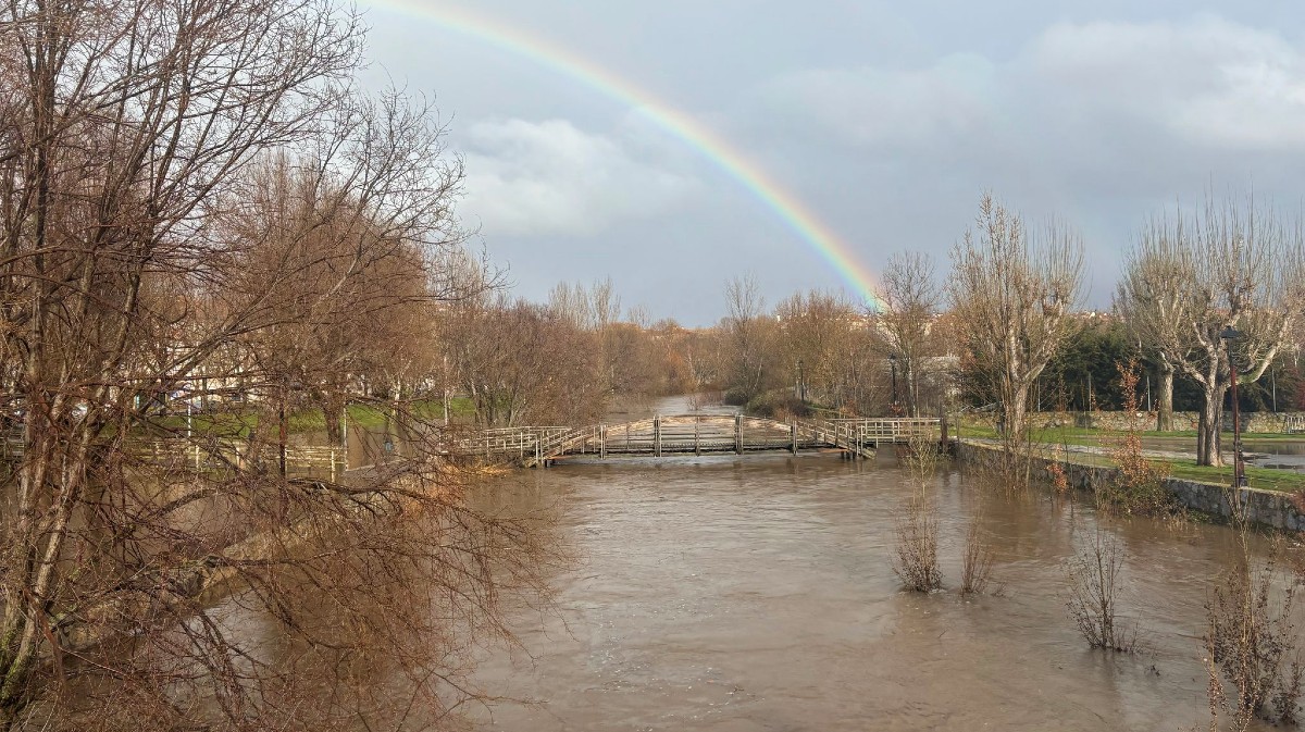 Río Alberche a su paso por Navaluenga en la tarde del sábado.A causa de la borrasca Jana, en Navaluenga el río muestra una crecida elevada, aunque ya a la baja, según la Confederación Hidrográfica del Tajo.