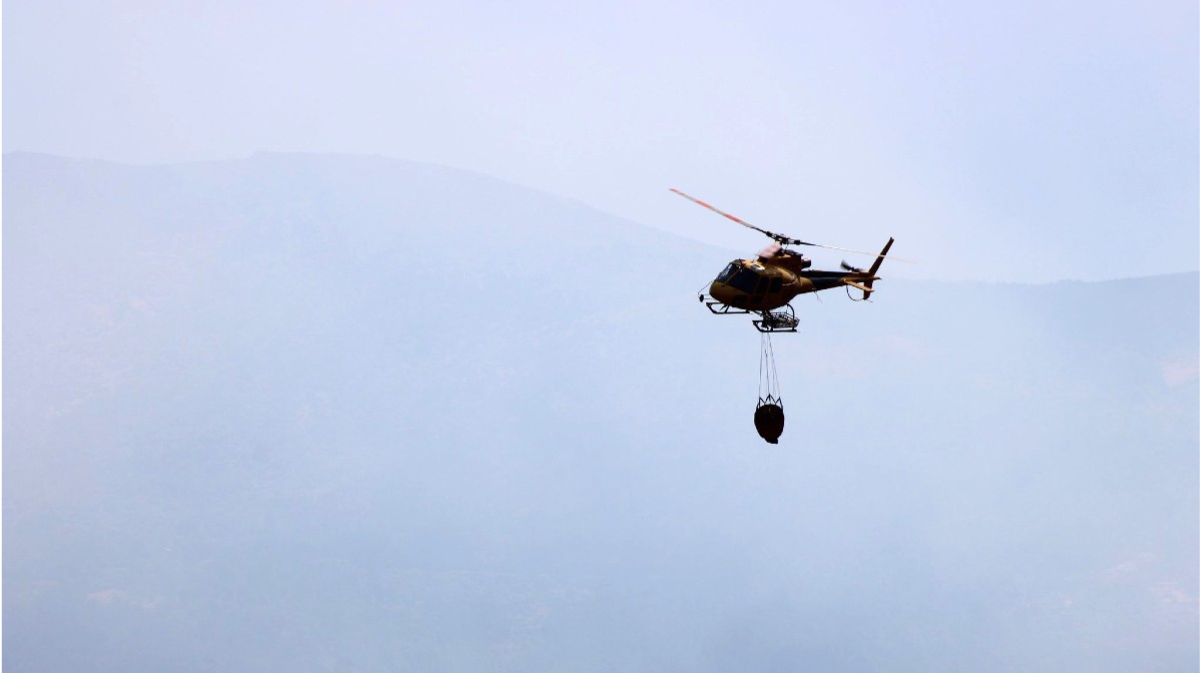 Un helicóptero en el incendio del Tiétar, el miércoles. Esto significa que no hay llamas que avancen sin control, y se trabaja en el enfriamiento del perímetro, de 25 kilómetros de longitud, a la vez que se trabaja en apagar algún punto aislado en que hay llama, y evitar que reproducciones puedan saltarse el confinamiento a fin de asegurar la estabilización del mismo, a pesar de que las llamas entrasen de madrugada en el término municipal de Arenas de San Pedro.