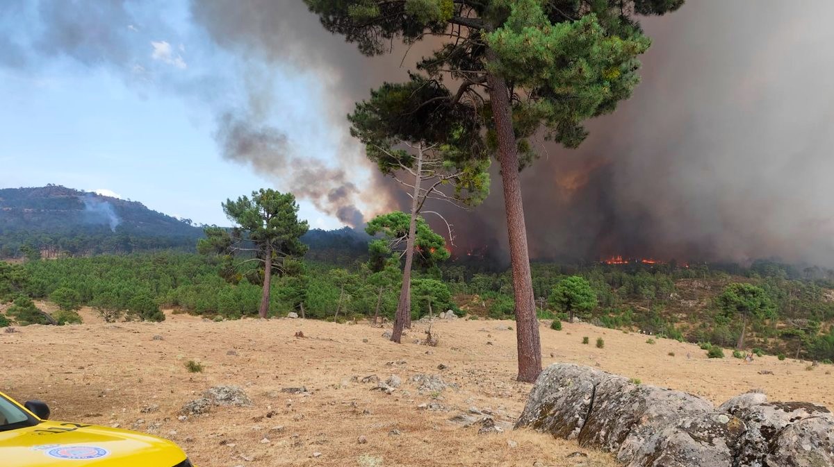 Incendio de San Bartolomé de Pinares. Foto: @bomberos_informa. Pese a la mejora, los vecinos de la urbanización Ciudad Ducal y del barrio de la Estación, de Las Navas del Marqués, permanecen desalojados por precaución.