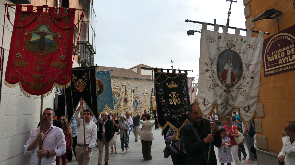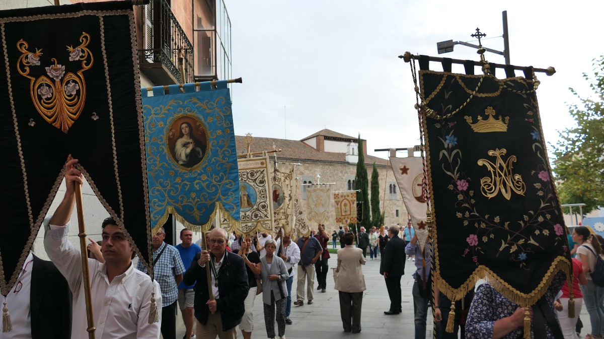 Peregrinación del Jubileo Diocesano de las Cofradías. Además de entidades de la capital han llegado cofradías de Arévalo, Arenas de San Pedro, Piedrahíta y San Esteban del Valle, que han mostrado sus estandartes en la comitiva que ha salido de la basílica de La Santa con destino a la catedral en una peregrinación en la que se ha rezado el rosario y que ha reunido a representantes de todas ellas y cientos de devotos, hasta cerca de un millar, acompañados de la imagen de la Virgen de la Esperanza.