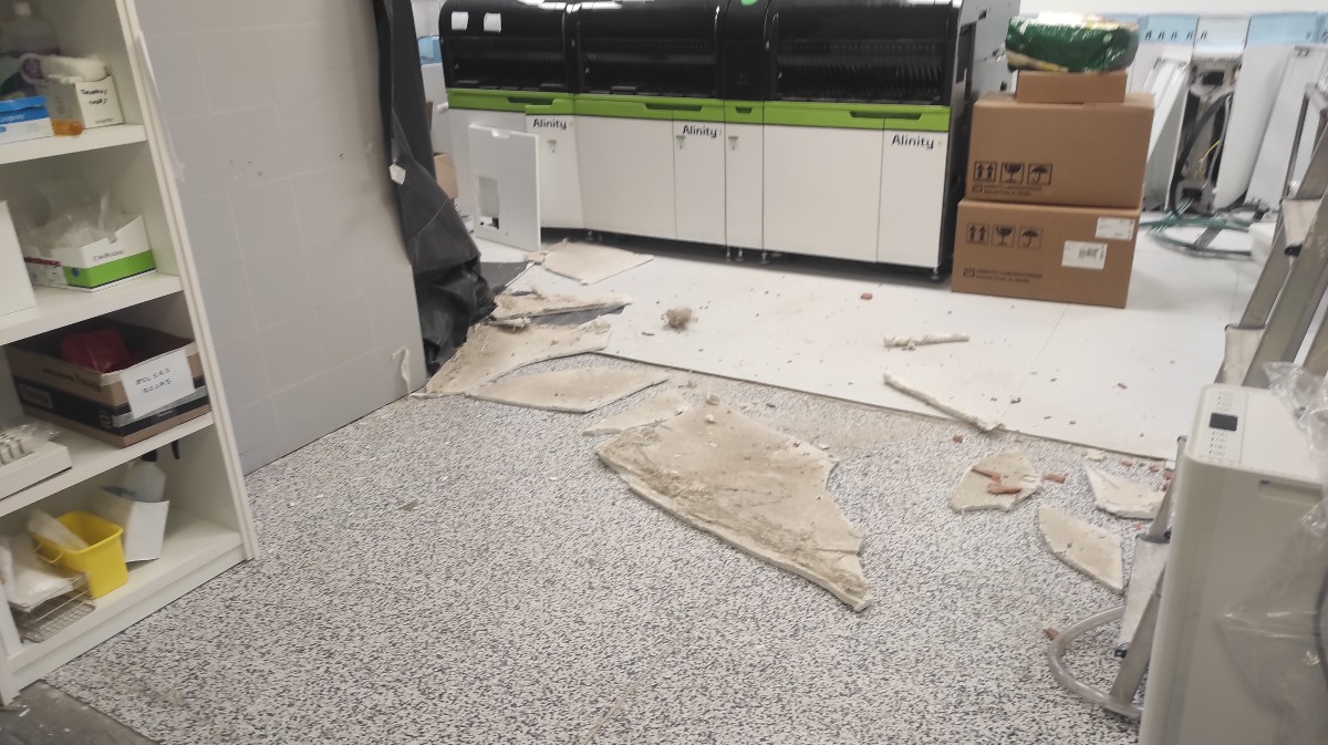 La zona afectada es "altamente transitada de forma continua por el personal del laboratorio y personal ajeno al mismo", por lo que, según insisten, de haberse producido el incidente unos segundos antes o después, se estaría “hablando de una auténtica tragedia”.