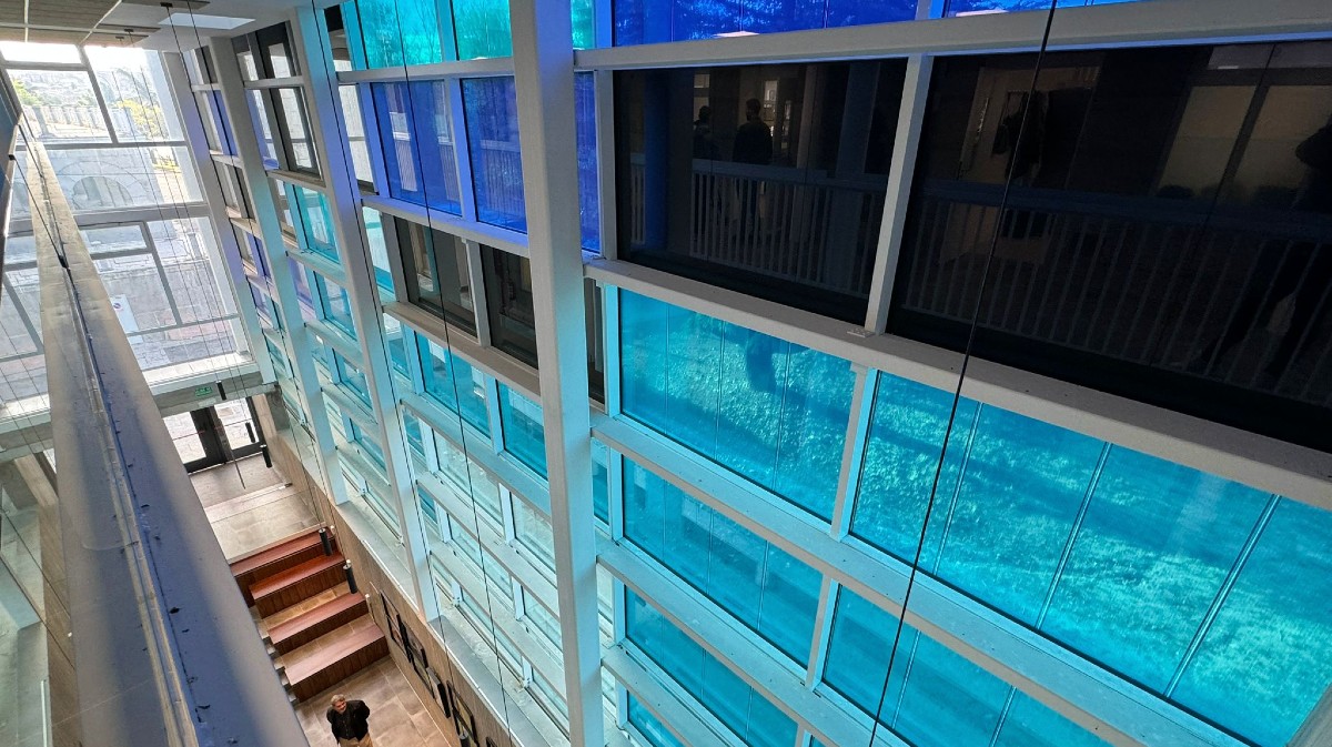 Muro-cortina fotovoltaico en la UCAV. Se trata de una gran cristalera colocada por delante del edificio anexo del antiguo Colegio de Huérfanos Ferroviarios, un inmueble que se construyó para galería de tiro cuando en los años 80 se situó en este edificio la Escuela de Policía.