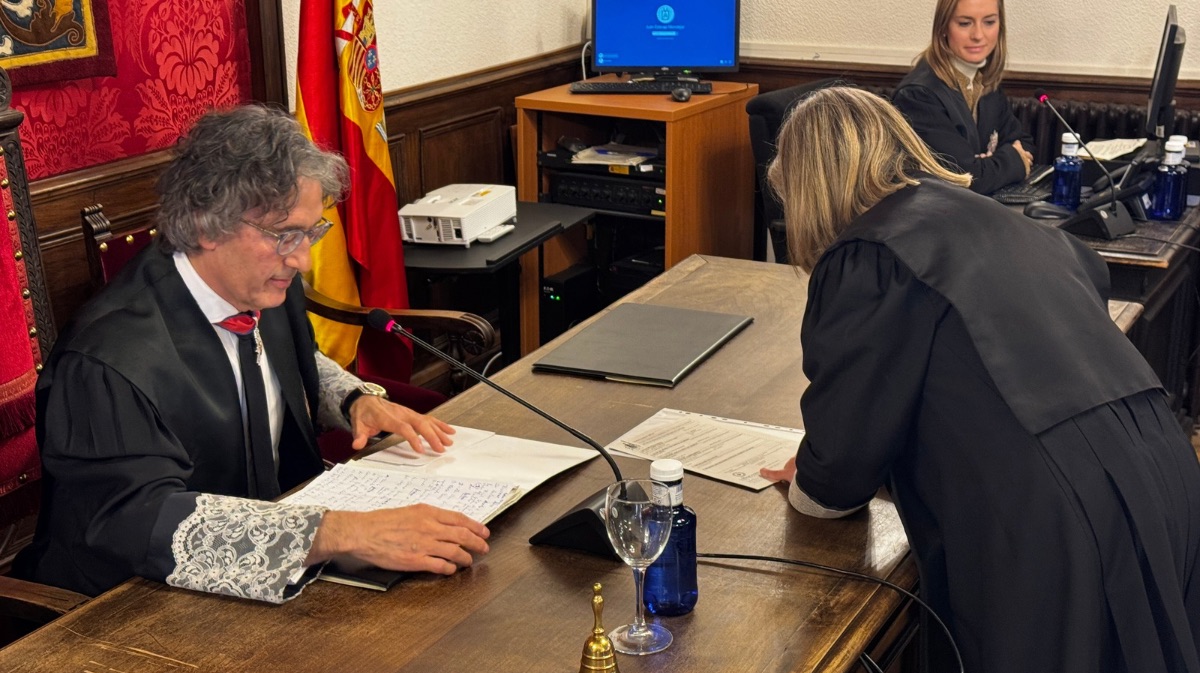 Barberán ha estado apadrinada por los fiscales Óscar Barrios y Javier Rojo, este último su predecesor en el cargo. Y han sido ellos quienes la han acompañado hasta la mesa de la sala, donde ha firmado su nuevo cargo.