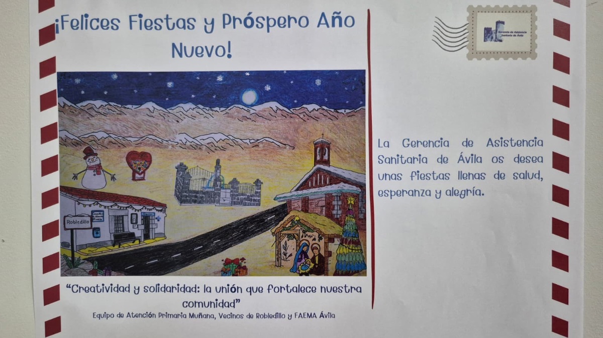 Vecinos de Robledillo y autoridades junto a la postal navideña Una iniciativa que tiene como objetivo resaltar la importancia de la medicina comunitaria y el acercamiento del sistema sanitario a la población. La iniciativa, titulada ‘Mi pueblo de postal. Robledillo’, además ha sido impulsada por el Equipo de Atención Primaria de Muñana.