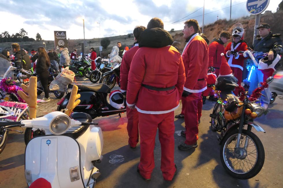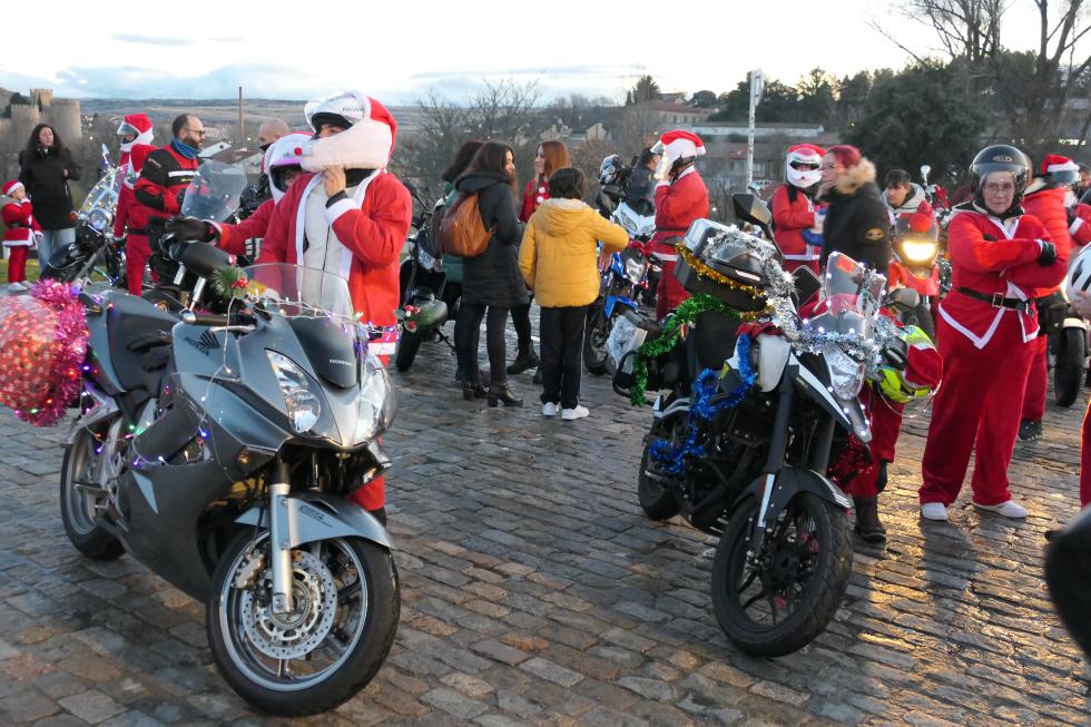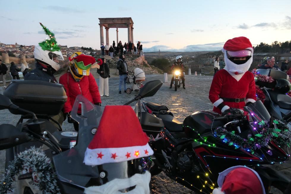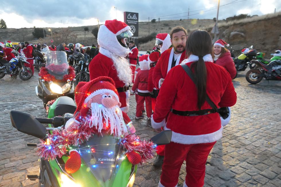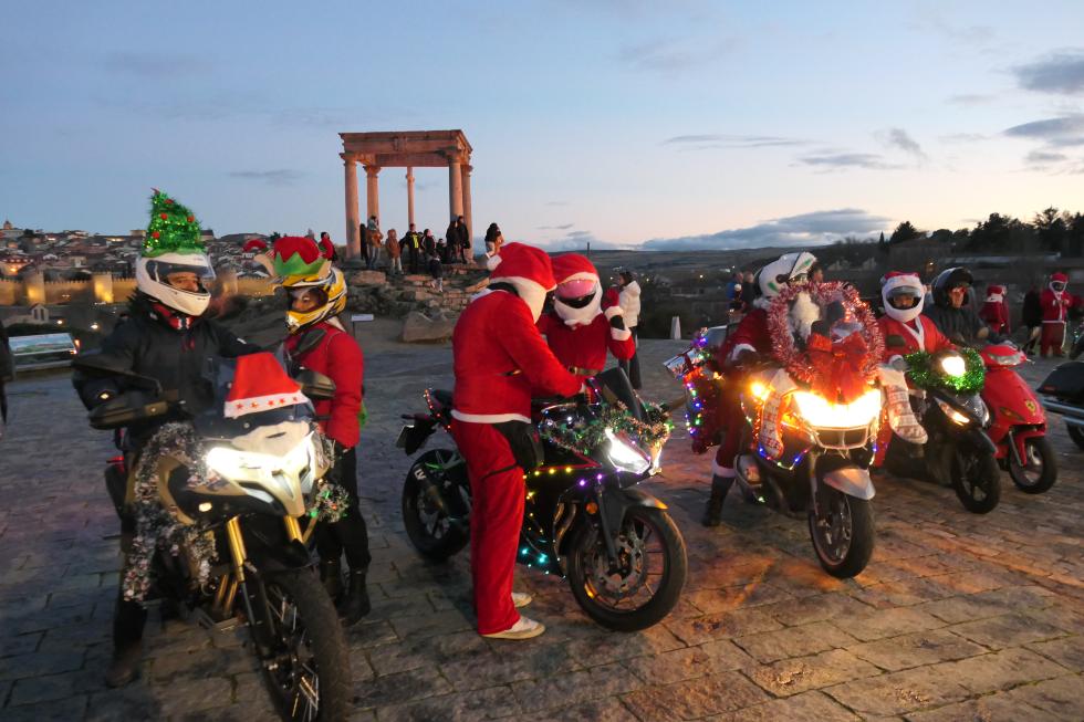 Papanoelada Motera en Ávila. La explanada de Los Cuatro Postes ha sido el punto de partida de una caravana de motocicletas engalanadas para estas estas fechas, desde donde han partido a las 18,20 horas del sábado, cuando han rugido todos los motores. El rojo de los Papa Noel y sus gorros ha dado colorido entre las motos adornadas con luces de colores, con la presencia de algún quad y patinetes.