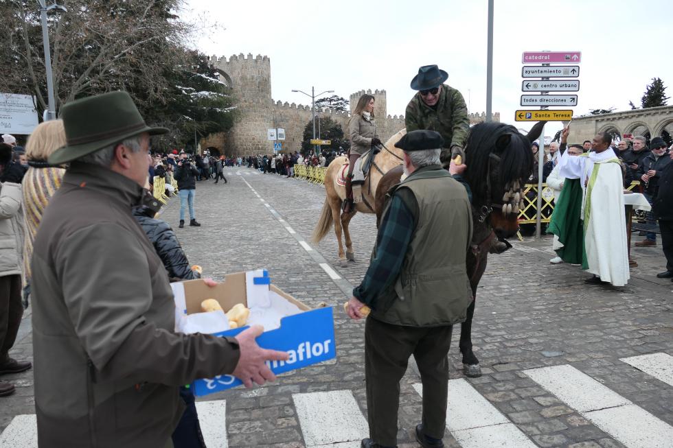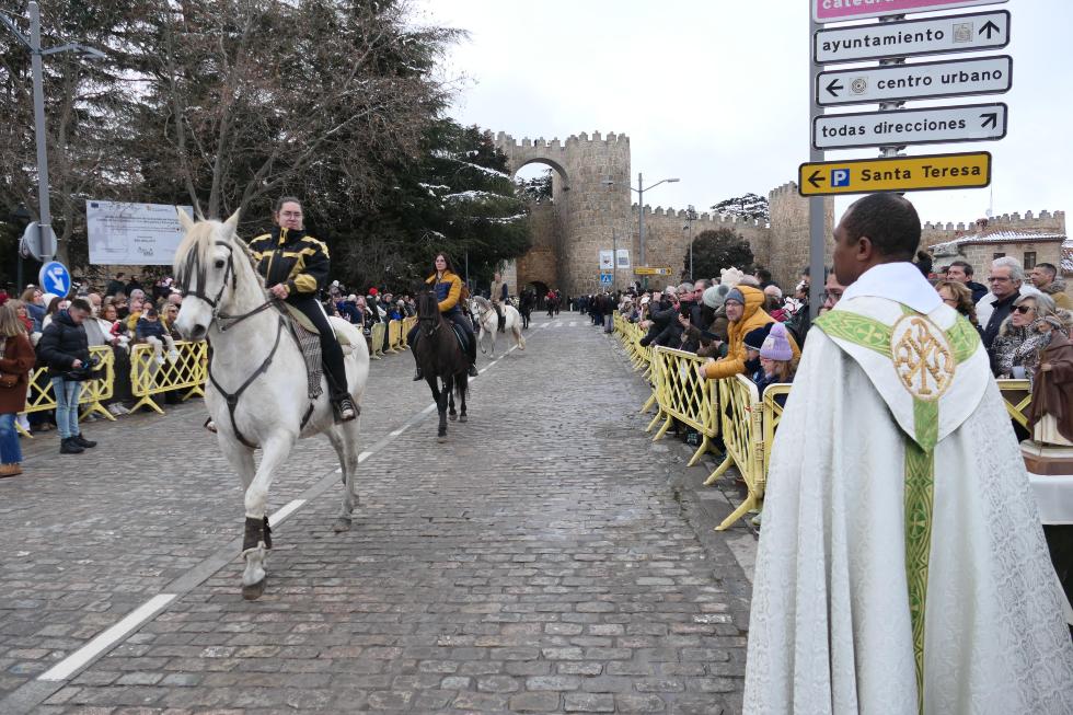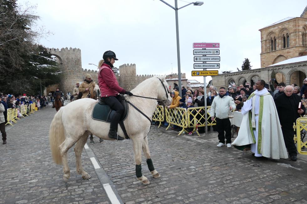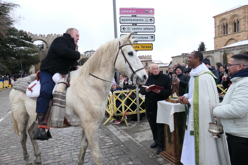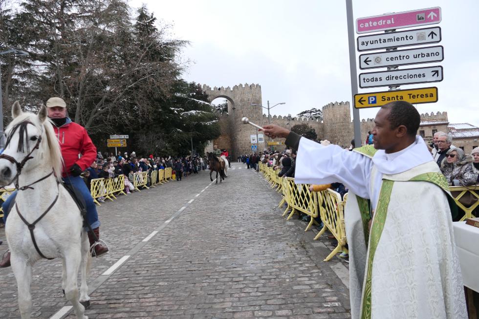 Desde poco después del mediodía, los jinetes de la Asociación Ecuestre Amigos del Caballo de Ávila comenzaron a concentrarse en la parte de atrás del Lienzo Norte para iniciar el recorrido por el centro de la ciudad. La comitiva ecuestre, formada por decenas de equinos desfiló por la plaza de San Vicente, donde fueron los primeros en recibir la bendición del sacerdote Telesforo Ndzie.
