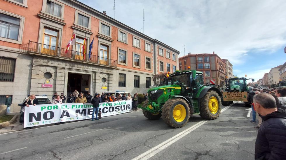 Convocados por la Alianza UPA-COAG, Asaja y la Unión de Campesinos de Castilla y León (UCCL), los tractores se han concentrado detrás de Lienzo Norte, para subir hacia la plaza de San Vicente, donde ha comenzado la protesta bajo la pancarta ‘Por el futuro y por salud, no a Mercosur’, en el marco de la oleada de protestas que se extiende estos días por todo el país. Desde allí han partido rumbo a la Subdelegación del Gobierno, pero parando antes a las puertas de la Delegación Territorial de la Junta.