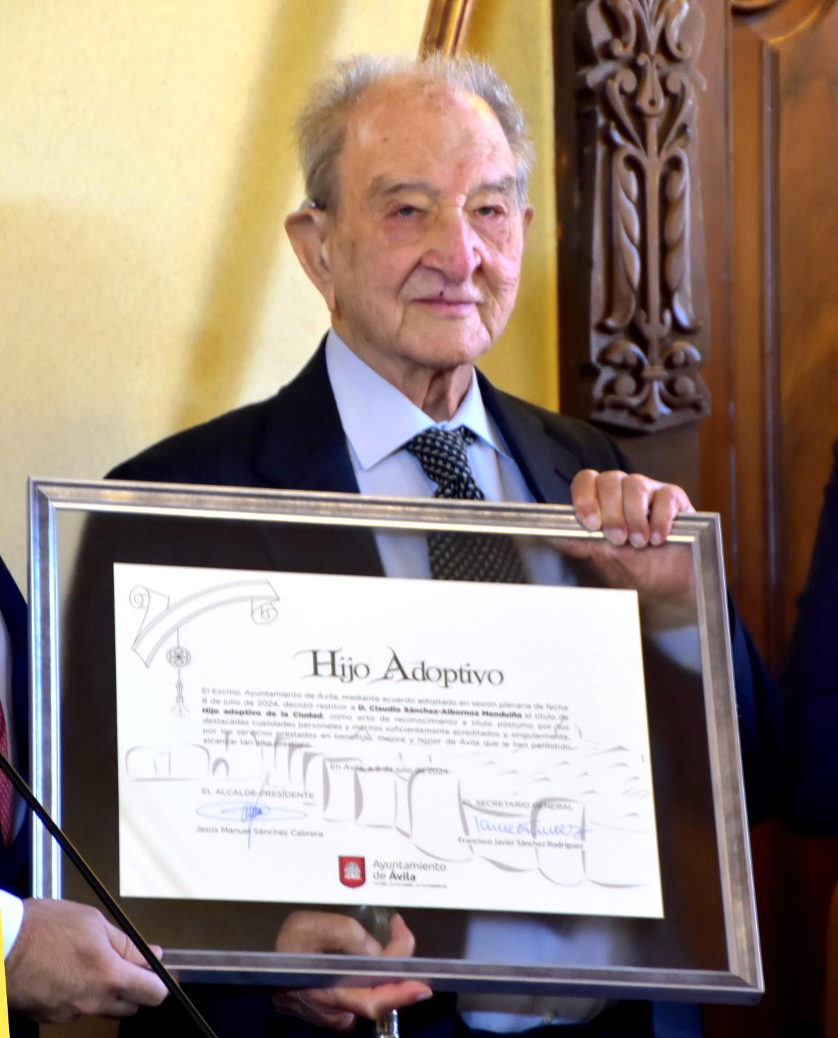 En 2024, Nicolás Sánchez-Albornoz protagoniza en nombre de su padre el acto que tuvo lugar en el Ayuntamiento de Ávila en el que se restituyó el nombramiento de Hijo adoptivo que le fue otorgado en 1924 a Claudio Sánchez-Albornoz, y luego retirado en 1937. Nicolás, que contaba en esa fecha con 98 años de edad, agradeció la iniciativa de restaurar el viejo derecho de su padre, señalando que lo que «podría haber dado lugar a un cierto resentimiento contra las instituciones y la gente de Ávila, no fue así», tal y como prueba que «siguió escribiendo muchas obras en las que recordaba y daba cuenta de su afecto a la gente de Ávila y también a la ciudad y a la provincia, una provincia a la que él había representado en tres legislaturas». Y concluyó que a pesar del largo tiempo transcurrido, lo importante es que la restauración del título «se ha hecho, y es una gran satisfacción para toda la familia y no sólo para ella, sino que supone una revisión del pasado de España… si mi padre pudiese haber vivido este momento, estaría muy satisfecho».