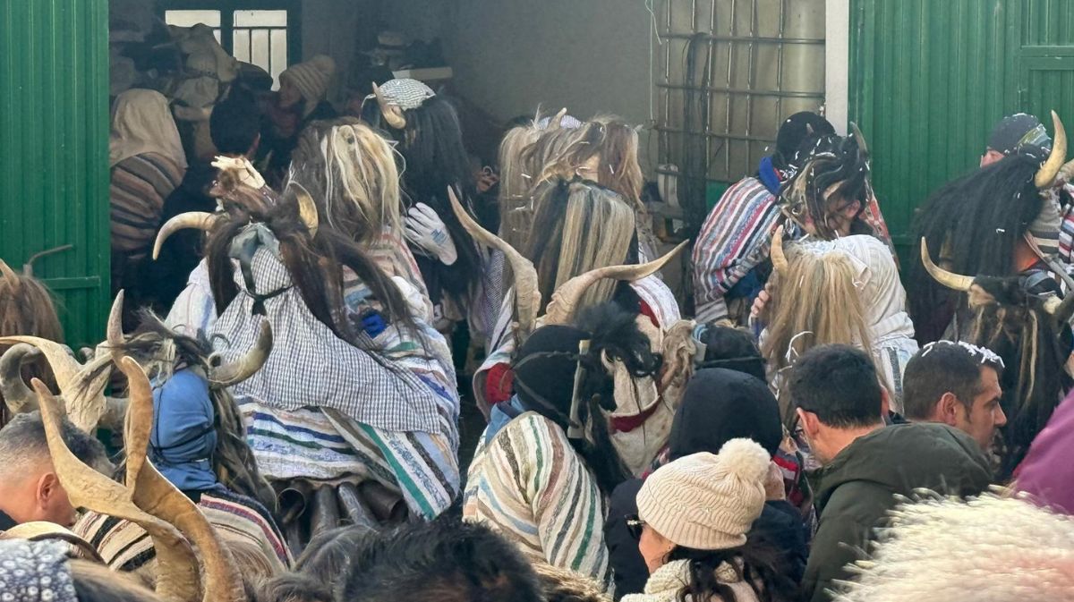 Un atuendo que se ha completado con unas máscaras de madera, que constan de una cornamenta y una llamativa pelambrera realizada con crines y colas de caballo. El punto final del aspecto lo ponen los cencerros de diferente tamaño y los sacos repletos de paja.