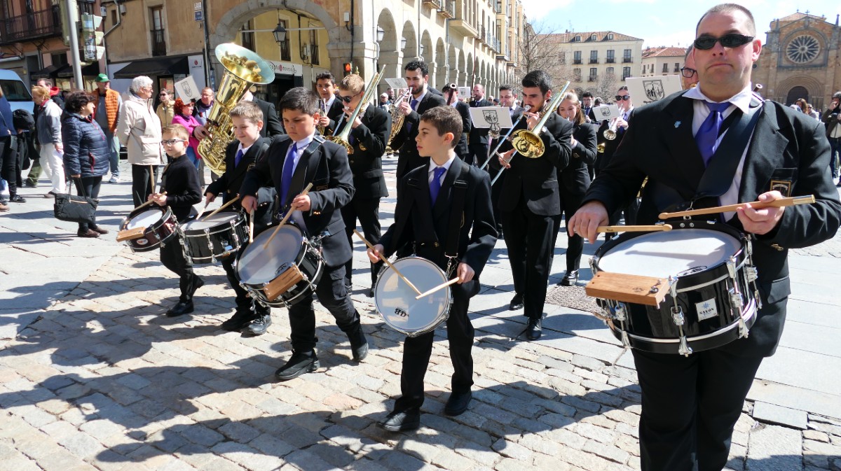 El concierto se ha desarrollado en la plaza del Mercado Chico, adornado ya para Semana Santa y convertido durante la mañana primaveral en escenario de un encuentro que ha combinado repertorio procesional, adaptaciones sinfónicas y piezas reconocibles para el público general. La convocatoria ha culminado con la interpretación conjunta de ‘Amparito Roca’.